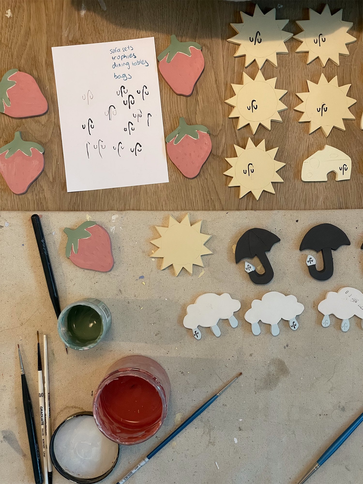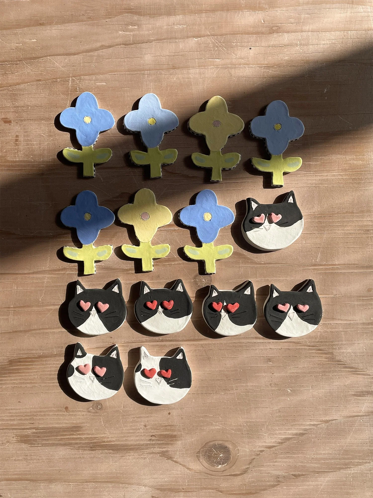Slab-built ceramic pins to add a little flair to your bags or clothing.